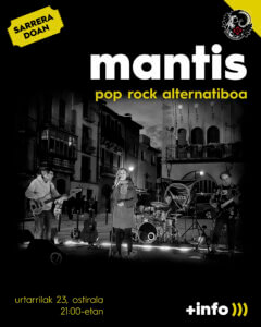 Nacidos en Olite, el grupo presenta su primer disco “Biltzen”, un trabajo lleno de energía, melodías pegadizas y letras personales. Tras empezar versionando a bandas como Lory Meyers o Novedades Carminha, hoy Mantis ya tiene voz propia y muchas ganas de compartirla contigo. ¡No te lo pierdas!