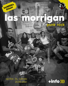Apirilaren 24an, ostirala, 20:00etan, Olitetik etorriko dira @las_morrigan, punk rockaren indarra eta jarrera zuzenean ekarriz. Adin guztientzako kontzertua izango da, energiaz betea eta giro beroa sortzeko modukoa, non publikoak eta taldeak momentu berean konektatzen duten.
